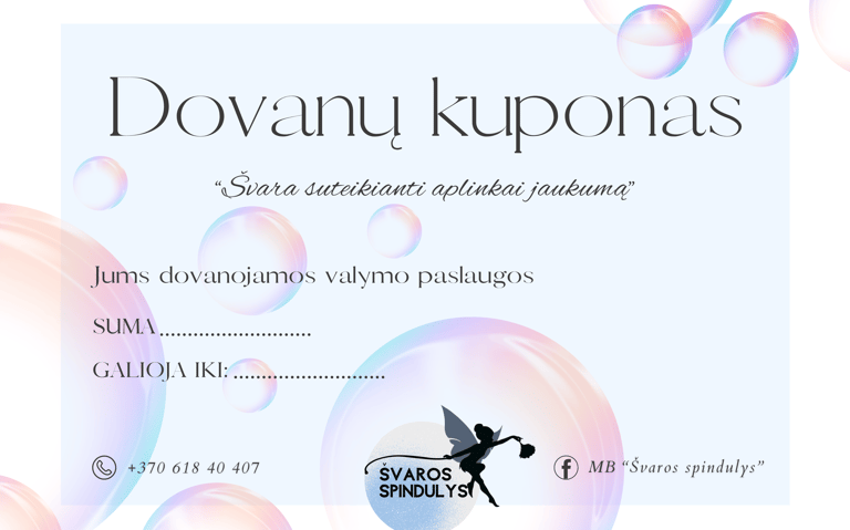 Padovanokite nepriekaištingą švarą ir ramybę su mūsų valymo paslaugų dovanų kuponu! Tai puiki dovana kiekvienam, kuris vertina tvarką ir komfortą savo namuose ar biure.